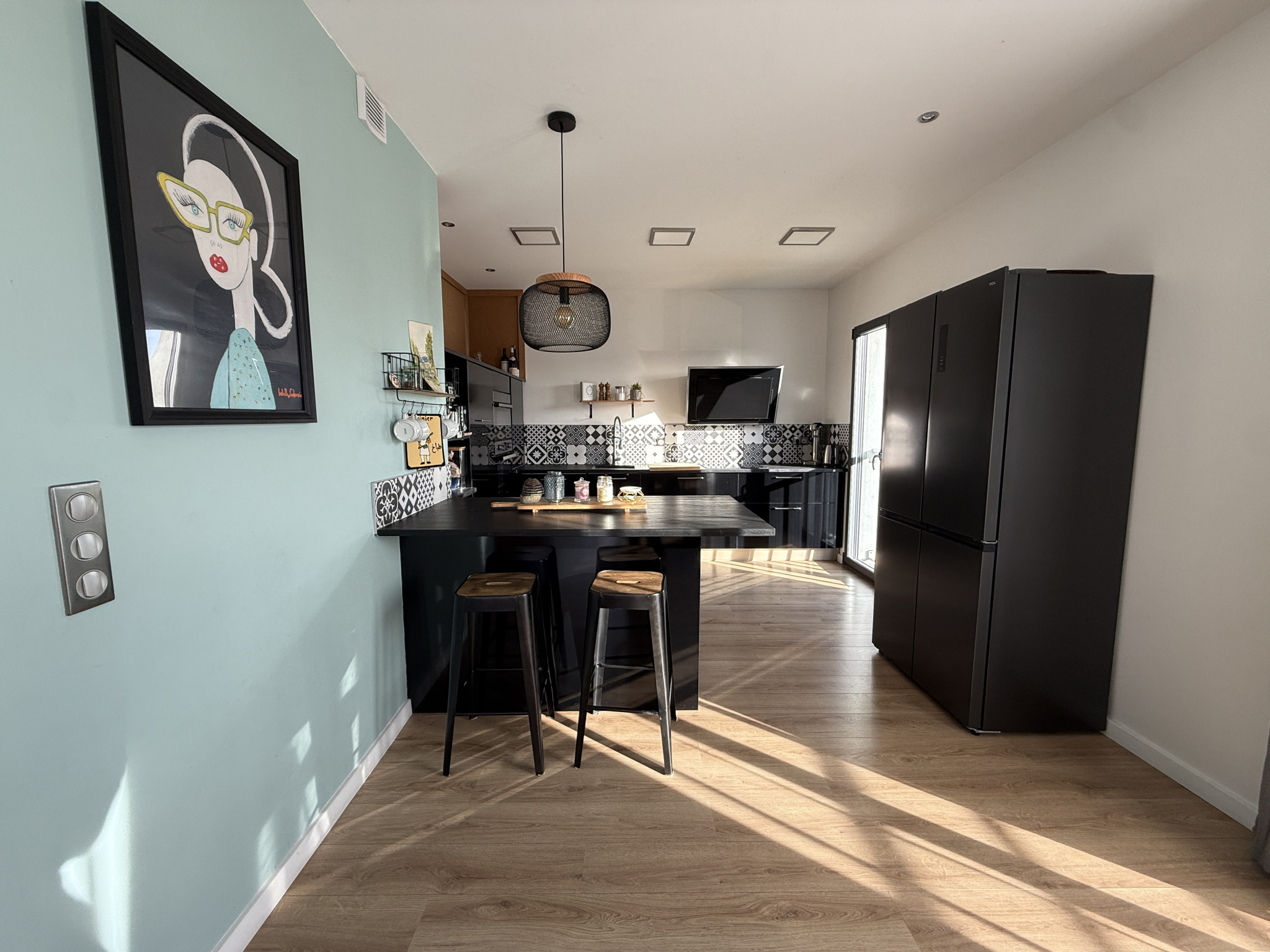 L’entrée ouvre sur un hall accueillant desservant un WC avec lave-mains et un cellier attenant. Le séjour avec cuisine entièrement équipée se prolonge naturellement vers une belle terrasse exposée est, idéale pour profiter des premières lumières du jour.
